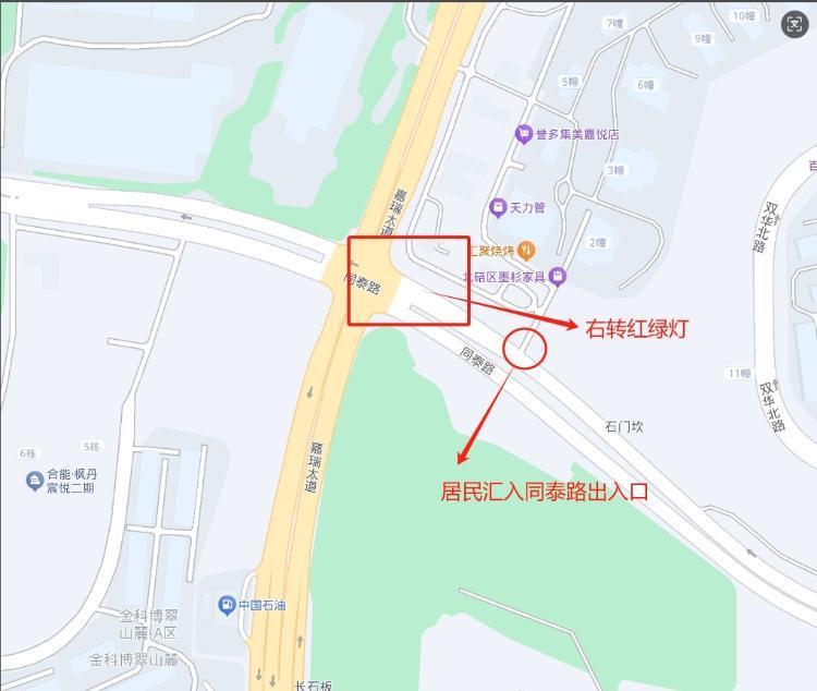 原因:同泰路(由东向西方向)与嘉瑞大道汇入口重启右转红绿灯,右转车辆(上嘉瑞大道)需要等红绿灯,而小区出入口距离右转道(右转路口)仅有30到40米左右的距离,右转道汇聚大量车流(特别是在工作日的早高峰期),阻断从小区出来正常汇入同泰路车流的通行空间。
