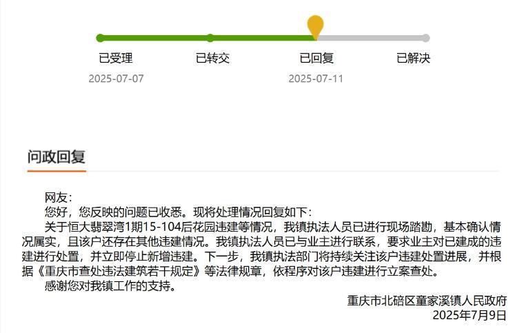 关于北碚区童家溪镇恒大翡翠湾1期15-104房屋存在违法建筑的情况,我镇执法大队已于2025年7月对该房屋进行现场踏勘,确认该户违法搭建建(构)筑物的情况属实。
