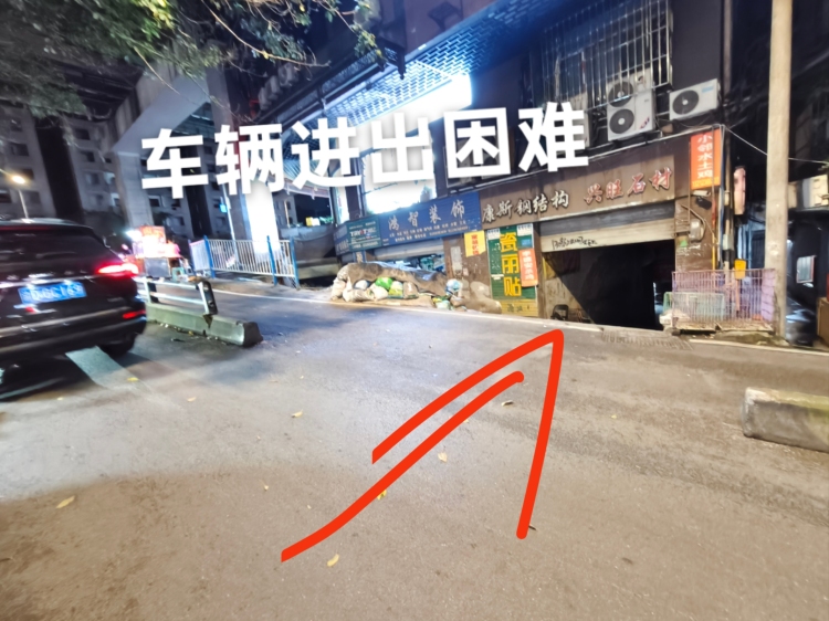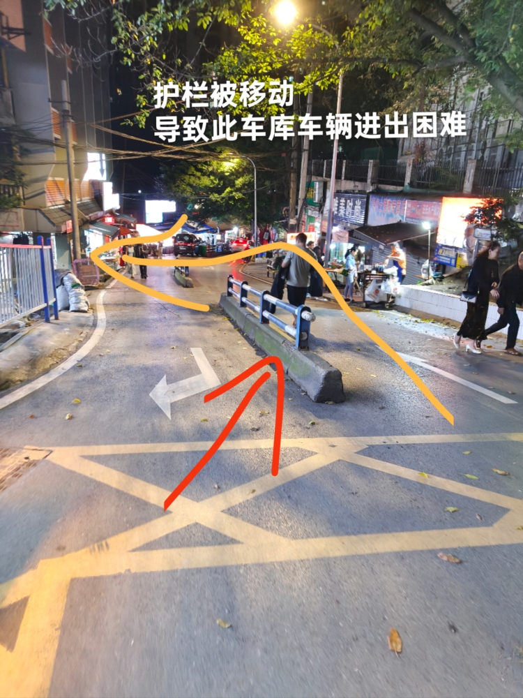 南岸海棠溪街道四公里菜市场这边,道路中间的栏杆被移位,进出口变窄,影响车库车辆进出,并且由于位于菜市场出入口,主路进出口人流量和车流量极大,严重影响车库车辆进出。希望有关部门将上段道理护栏往上移动两米或者直接撤掉上段道路护栏。