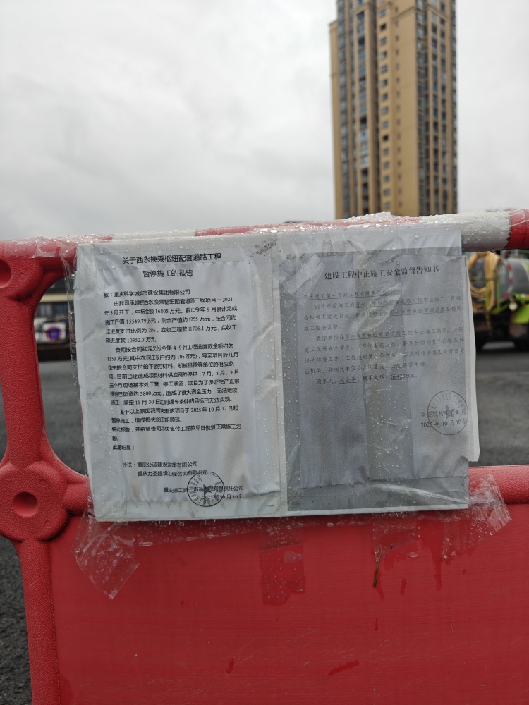 重庆高新区科学城西永赖家桥枢纽站配套道路一直断断续续的的修建 一个断头路要修四五年时间 到目前仍处于停工状态 严重影响周围居民出行 周围道路已经沦陷为大型停车场 各种乱停 没人管制 中小学学生上学放学公交车无法进入 现在承建单位又发出欠款的公告 烦请科学城各位高层领导对西永赖家桥枢纽站配套道路关注