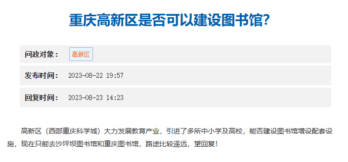 华龙网-新重庆客户端(周鹏 陈思睿)8月22日,网民郭女士(化名)在华龙网重庆网络问政平台发帖询问,高新区引进了多所中小学及高校,但附近却没有图书馆,相关部门能否在高新区建设图书馆?