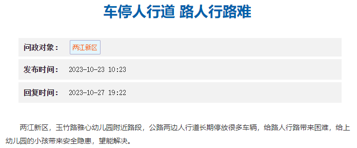 接到刘先生的情况反映后,华龙网重庆网络问政平台及时联动了两江新区,10月27日,两江新区大竹林街道进行了回复。