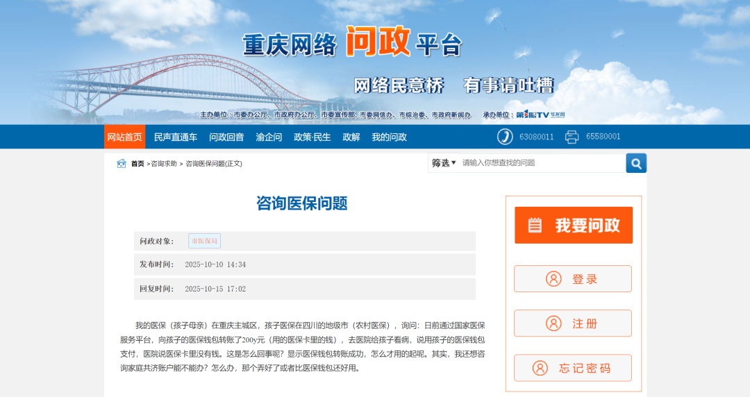 这位市民在帖文中详细描述了她的疑问:自己的医保在重庆主城区,而孩子的医保在四川某地级市。她通过国家医保服务平台,成功从自己的医保卡向孩子的“医保钱包”转账了200元。然而,当孩子去医院看病,试图使用这笔钱支付时,医院却反馈“医保卡里没有钱”。